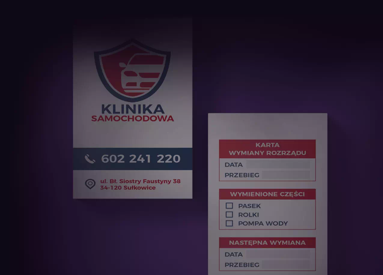 Identyfikacja miała być wdrożona na różnych materiałach – wizytówkach, kartach przeglądu oraz tablicy rejestracyjnej. Każdy element musiał zachować czytelność, proporcje logo oraz spójność estetyczną, aby wzmacniać rozpoznawalność marki.