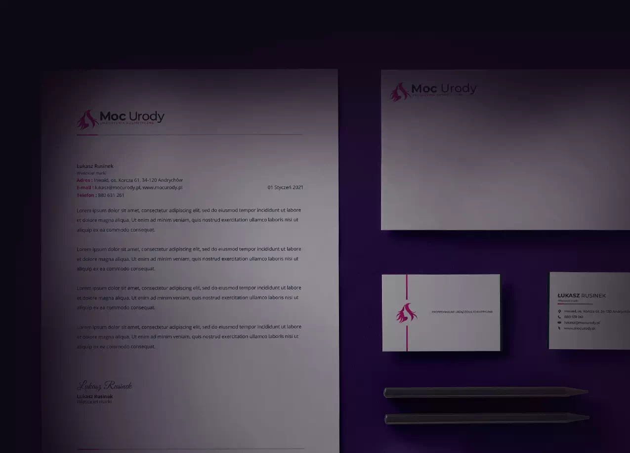 Elementy brandingowe zapewniły Moc Urody unikalny wizerunek. Nowoczesny i minimalistyczny design trafił w gusta grupy docelowej, skutecznie komunikując profesjonalizm i zaangażowanie firmy w dostarczanie najwyższej jakości usług.