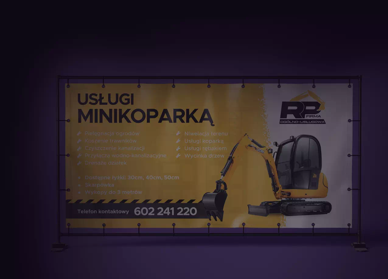 Zaprojektowany baner przyciąga uwagę dzięki kontrastowej kolorystyce (żółty i czarny), dużemu zdjęciu koparki oraz wyraźnym czcionkom. Układ graficzny jest przejrzysty, co ułatwia szybkie zapoznanie się z ofertą.