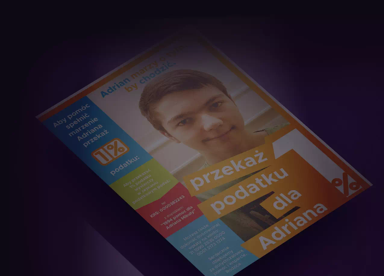 Głównym celem projektu było stworzenie dwustronnej ulotki formatu A5, która zachęci odbiorców do przekazania 1% podatku na rzecz 14-letniego Adriana Mikuły.